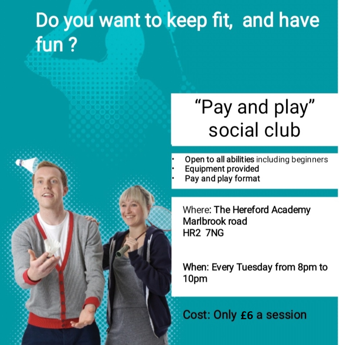 We also run a social badminton session in Tenbury on Wednesday evenings called Marches social badminton which is £6 and held at Tenbury High School, Oldwood Road. WR15 8XA